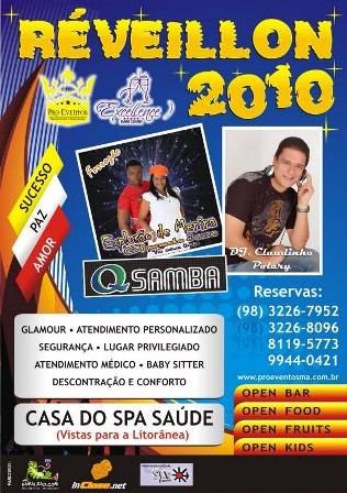 Festa da Virada do Ano Novo de frente para o mar Réveillon 2010 em São Luís Dia: De 31 a 1º de janeiro de 2010 Onde: Casa do SPA Saúde na Litorânea Shows e Atrações: Explosão de Menina (Forró) Q- Samba (Pagode e Samba) DJ Claudinho Polary (Música Eletrônica) TV Kamaleao (Cobertura) * Luxo e Glamour * Atendimento Personalizado * Segurança * Lugar Privilegiado * Baby Sitter * Atendimento Médico * Descontração e Conforto OPEN BAR - OPEN FOOD - OPEN FRUITS - OPEN KIDS Vista para o Mar de cima da Casa Vista para a Praia privilegiada com Queima de Fogos Fachada da Casa de Frente para o Mar