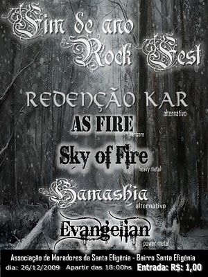 Fim de Ano Rock Fest na Santa Efigênia Dia: 26 de Dezembro (Sábado) Apartir das 18hs Onde: Associação de Moradores da Santa Efigênia Atrações: Redenção Kar Sky of Fire AS FIRE Samashia Evangelian Preço dos Ingressos: R$ 1,00 Pontos de Venda: No Local Coberturas de Fotos da Equipe Kamaleao: Aguarde! Mais Fotos Onde Tem Rock, Tem Kamaleao!