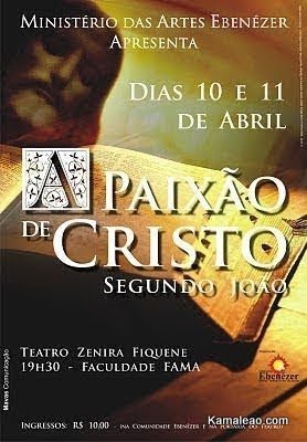 Peça Teatral A Paixão de Cristo segundo João Dia: 10 e 11 de Abril Hora: 19:30hrs Onde: Teatro Zenira Fiquene - FAMA Turu