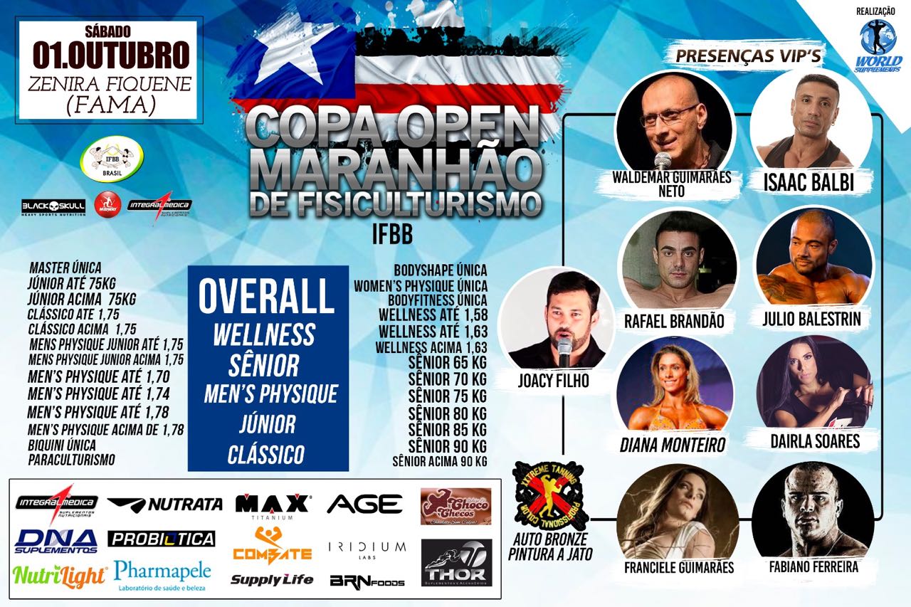 17h00 - Início do Campeonato ![]() No sábado dia, (01.10), acontece a Copa Open Maranhão de Fisiculturismo no Teatro Zenira Fiquene com uma programação diversificada um dia todo como Pesagem das 09h ás 13h, logo em seguida terá Boxe (Bradar), Muay Thai, (ASDAN), Fit Dance, campeonato, Paraculturismo, master masculino overall, bikini fitness overall. bodyfitness overall, women’s physique overall, categoria especial única (cadeirantes), fisiculturismo clássico overall, wellness fitness overall e men’s physique overall dentre outras ações. A Copa Open Maranhão de Fisiculturismo tem como parceria da IFBB – Confederação Brasileira de Musculação Fisiculturismo e Fitness que promove o evento que reúne os principais atletas do Brasil.