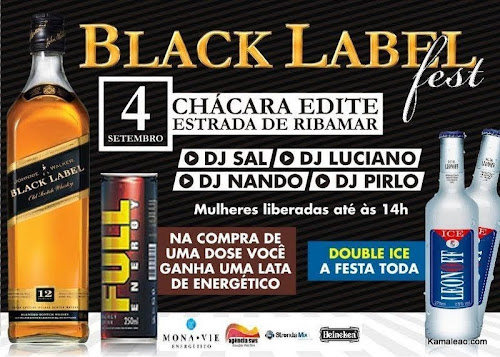 BLACK LABEL FEST Dia: 4 de setembro - sábado Onde: Chácara Edite - Estrada de Ribamar Atrações: DJ Sal Dj Luciano DJ Pirlo DJ Nando Coberturas de Fotos da Equipe Kamaleao: www.kamaleao.com/fotos Onde Tem Festa, Tem Kamaleao!
