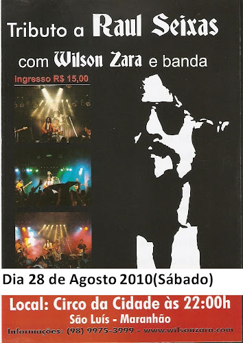 Show Wilson Zara - Tributo a Raul Seixas Dia: 21 de Agosto - Sábado ADIADO PARA DIA 28 DE AGOSTO Onde: Circo da Cidade Atrações: Wilson Zara e Banda Vídeo Wilson Zara em Tributo a Raul Seixas - Metamorfose Ambulante Preço dos Ingressos: Telefones: (98) 9975-3999 Coberturas de Fotos da Equipe Kamaleao: www.kamaleao.com/fotos Onde Tem Festa, Tem Kamaleao!
