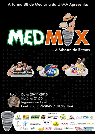 Festa MEDMIX - A Mistura de Ritmos Dia: 20 de Novembro as 21:30 Onde: Fazenda - Turu Atrações: Jhonatan & Jardel (Sertanejo Universitário) Formato A5 (Samba e Pagode) Esfregue Dance (Forró) Ingressos: No Local Informações: (98) 8859-9045 (98) 81603364 Coberturas de Fotos da Equipe Kamaleao: www.kamaleao.com/fotos Onde Tem Festa, Tem Kamaleao!