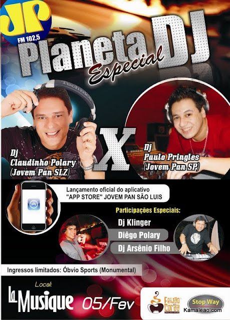 Festa Planeta DJ Especial Jovem Pan em São Luís Dia: 05 de fevereiro Onde: La Musique Bar Atrações: DJ Paulo Pringles Dj Arsenio Filho Dj Claudinho Polary Dj Diego Polary Lançamento oficial do aplicativo da Rádio Jovem Pan São Luís no App Store - Itunes Preço dos Ingressos: ?????? Pontos de Venda: Loja Obvio Monumental Onde Tem Festa, Tem Kamaleao!