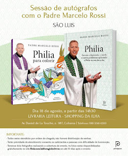 Padre Marcelo Rossi estará nesta terça-feira, 18 de agosto no Shopping da Ilha para o lançamento dos livros 'Philia' e 'Philia para colorir' a partir das 14h. Os livros estão disponíveis para venda na Leitura do Shopping da Ilha. A entrada estará liberada a partir das 6h da manhã, pelo acesso lateral do Shopping da Ilha em frente ao Espaço Reseva. O encontro com o padre se dará na loja em frente ao Rei do Mate (L2). Será um dia de muitas bênçãos e orações.