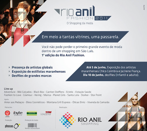 O Rio Anil Fashion 2011 encerra nesta sexta feira (10.06) com um grande desfile na praça de eventos do Rio Anil Shopping. 13 lojas estão participando do evento que vai ter a partição de celebridades como Paulo Zulu e Samara Felippo, modelos de São Paulo e Rio de Janeiro que já estrelaram campanhas e editoriais de modas internacionais, além de vários modelos maranhenses selecionados em um badalado e rigoroso casting.
