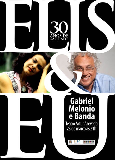 Show Homenagem à Elis Regina em São Luís com Gabriel Melônio Dia 23 de março 2012 Onde: Teatro Arthur Azevedo Horário: 21h Preço de Ingressos: Plateia e Frisa R$ 30,00 Camarote e Balcão R$ 20,00 Galeria R$ 15,00 Telefones: (98) 8822-8506 (98) 9111-8884 Realização: Mário Jorge Produções Onde Tem Elis Regina, Tem Kamaleao!