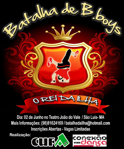 Batalha de B.boys - O Rei da Ilha Dia 02 de junho 2012 - Sábado Onde: Teatro João do Vale - São Luís Gêmeos dançando Hip Hop FreeStyle Objetivo: Difundir e divulgar na busca por espaços para a arte e cultura das danças urbanas do Hip-Hop fomentando e desenvolvendo a dança de rua em todo o Estado do Maranhão Inscrição Gratuita: Fone: (98) 81624169 Email: batalhadailha@hotmail.com Preço de Ingressos: Entrada Franca Realização: CONEXÃO DANÇA CUFA Maranhão Onde Tem Hip Hop, Tem Kamaleao!