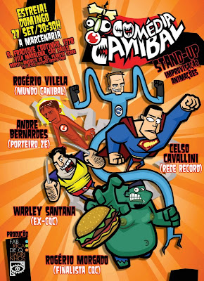 COMÉDIA CANIBAL”: Um programa de TV que você assiste no teatro”. O Mundo Canibal criou um show de humor que mistura notícias da semana, lançamentos dos famigerados vídeos do Mundo Canibal, jogos de improvisação, sketches de humor, quadros interativos com animação em tempo real, participação de platéia e é claro stand up comedy. Tudo isso apresentado pelos comediantes “Mais Inteligentemente Burros da Terra”: Fabiano Cambota, Gus Fernandes, Marco Zenni e Rogério Vilela.